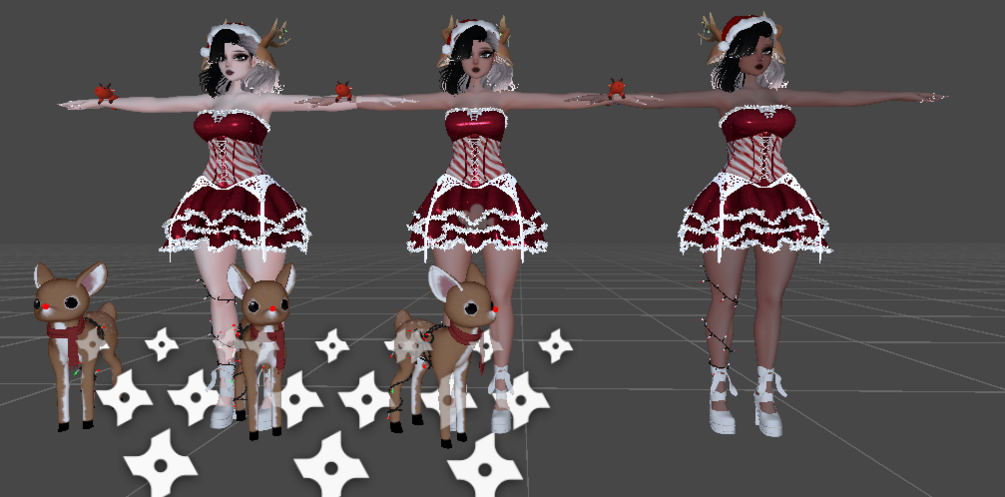 Head, Body, Hair, Deer Set, Santa Hat, Rings, Dress, Panties, Heels, Leg Lights, Snow Particles, Candy Knife, Deer Follower