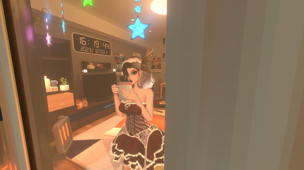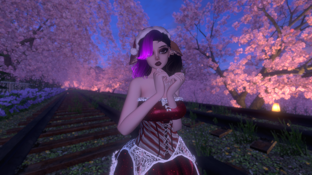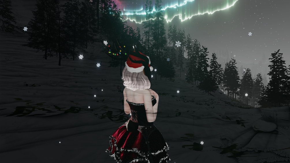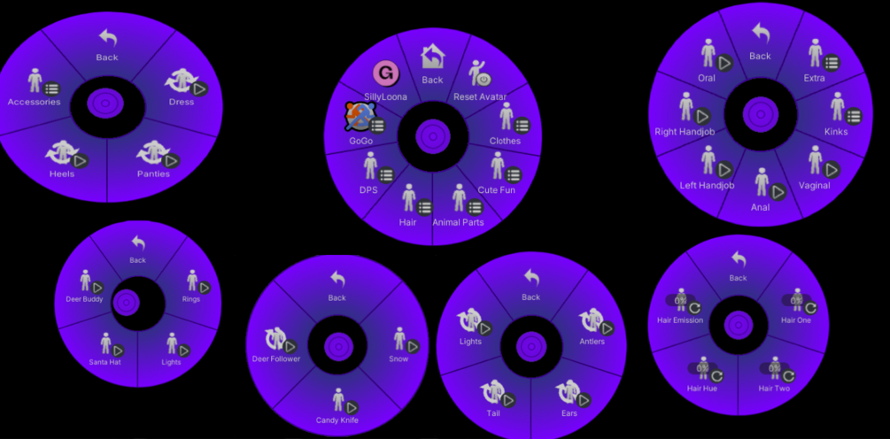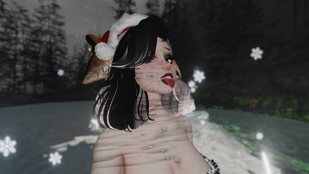 Dress(Q), Panties(Q), Heels(Q), Rings (PC Only), Leg Lights (PC Only), Santa Hat(Q), Deer Buddy (PC Only), Snow Particles ( PC Only), Candy Knife(Q), Deer Follower (PC Only), Animal parts(Q), Hair 1 & 2(Q), Hair Hue & Emission (PC Only), DPS (Only works on PC)
